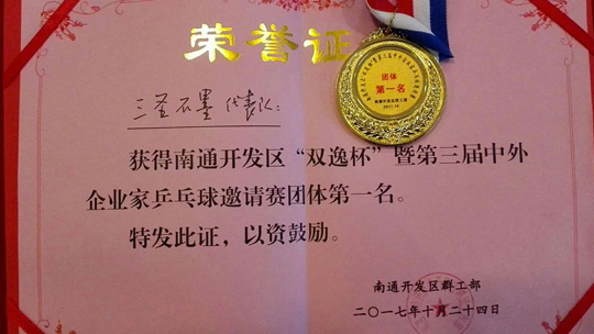 10月24日,三圣石墨代表隊參加南通開發區“雙逸杯”暨第三屆中外企業家乒乓球邀請賽,通過一天的緊張角逐,過關斬將,最終在24支代表隊中脫穎而出,獲得本次比賽冠軍。