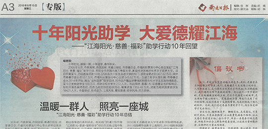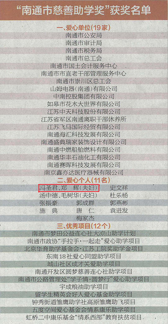 2018年8月15日,南通市教育局、南通市民政局、南通日?qǐng)?bào)社、南通市慈善總會(huì)、南通市福利彩票發(fā)行中心公布了“南通市慈善助學(xué)獎(jiǎng)”評(píng)選結(jié)果,南通三圣石墨設(shè)備科技股份有限公司董事長(zhǎng)馮圣君、鄭輝夫婦榮獲“南通市慈善助學(xué)獎(jiǎng)愛心個(gè)人”光榮稱號(hào),全市僅有11人獲此殊榮。
