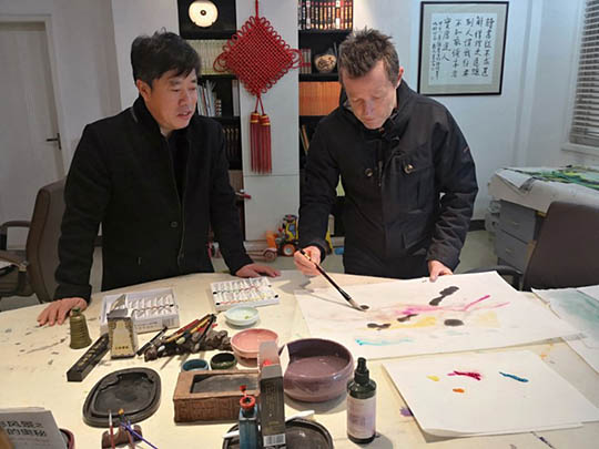 當(dāng)代藝術(shù)的杰出代表、瑞士巴塞爾著名藝術(shù)家chris先生,也是首次來(lái)到中國(guó),用他的話說,來(lái)到了三圣就有回家的感覺,一切是那么的自然、美好。他欣然在三圣畫室創(chuàng)作兩幅作品留念。