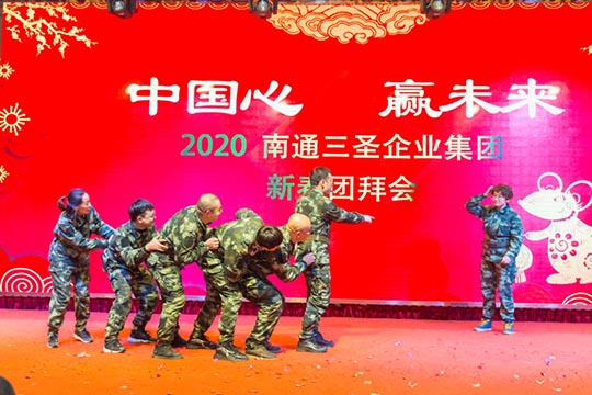 為了弘揚體育健身精神,本次年會上凸顯對“體育強則中國強”的高度關注:曾參加今年“南通國際馬拉松”賽事的三圣健將們,高舉國旗、彩球,插上雙翼、身披戰袍,用自己的特殊方式,威風凜凜地依次入場;彩虹跑小組成員也自信亮相,搞怪機靈的鼠大哥帶著鼠弟鼠妹接過豬師兄的接力棒開啟了2020新大門,合唱合舞燃爆現場。