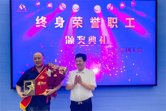 三圣奮斗史中閃耀著這樣一顆璀璨之星,他以堅(jiān)定的信念和不懈的努力,登上榮譽(yù)巔峰,成為開發(fā)區(qū)當(dāng)之無愧的一名“金牌員工”,并被三圣集團(tuán)董事會(huì)、三圣工會(huì)授予“終身榮譽(yù)職工”的光榮稱號(hào)。